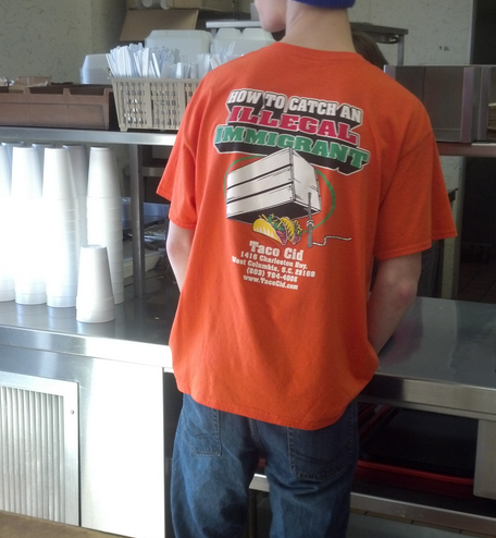 As the Palmetto Public Record notes, a South Carolina reporter tweeted a photo yesterday of someone who appears to be a Taco Cid restaurant employee wearing the offensive shirt.