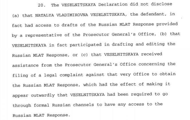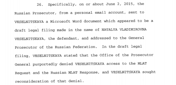 As the indictment reads, Veselnitskaya “in fact had access to drafts of the Russian MLAT Response provided by a representative of the Prosecutor General’s Office.”