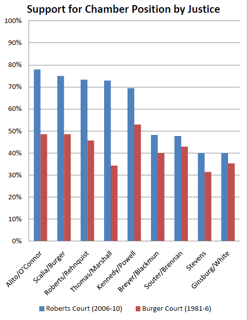 Once Kennedy departs from areas such as criminal justice or gay rights, however, his record turns hard right. Although there is no perfect metric for how often a justice sides with entrenched wealth and power before the 99 Percent, the progressive Constitutional Accountability Center recently examined how often each justice votes with the nation’s top corporate interest group — the United States Chamber of Commerce. By this metric, Kennedy is only slighly less pro-corporate than his fellow partisans: