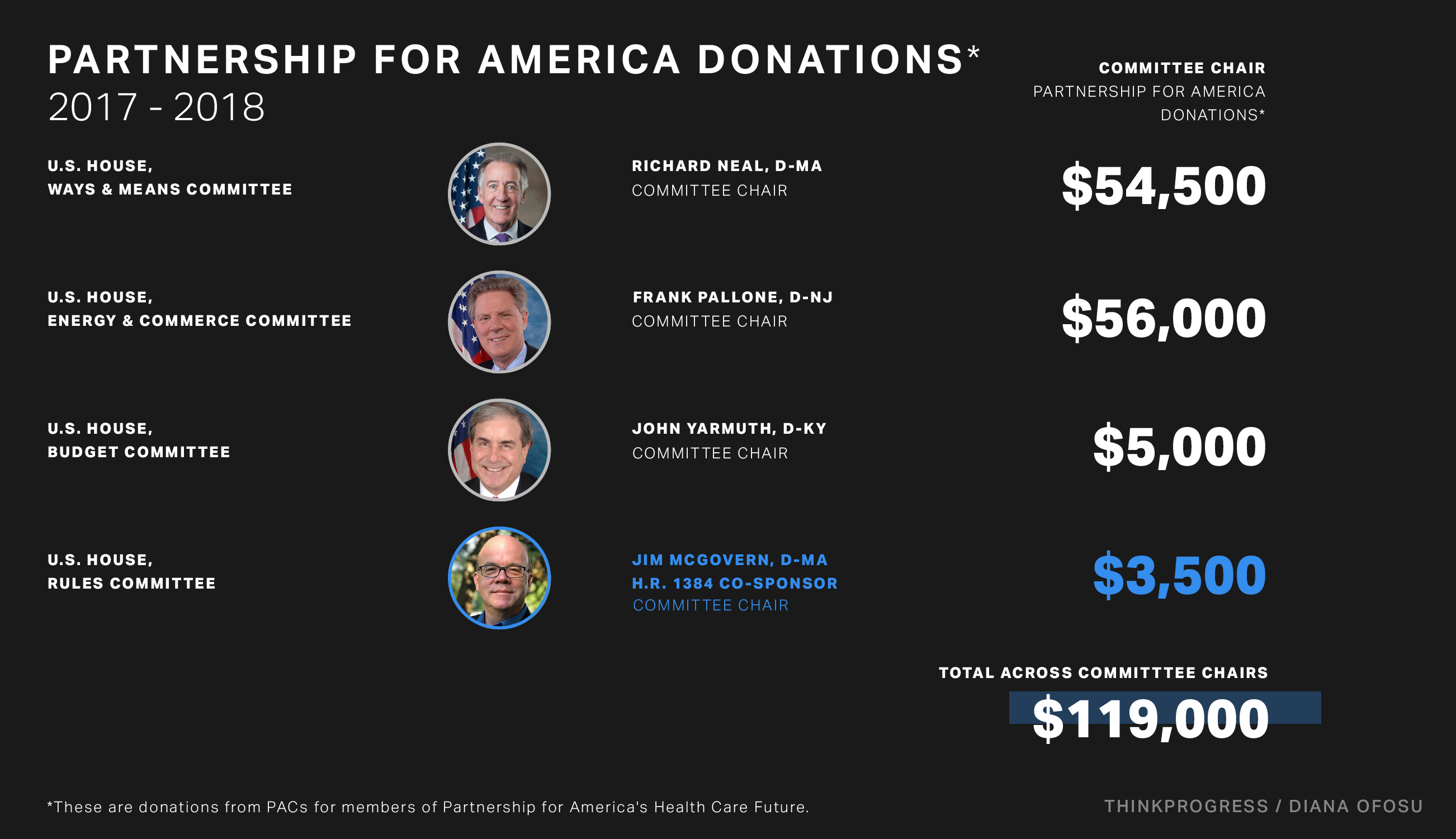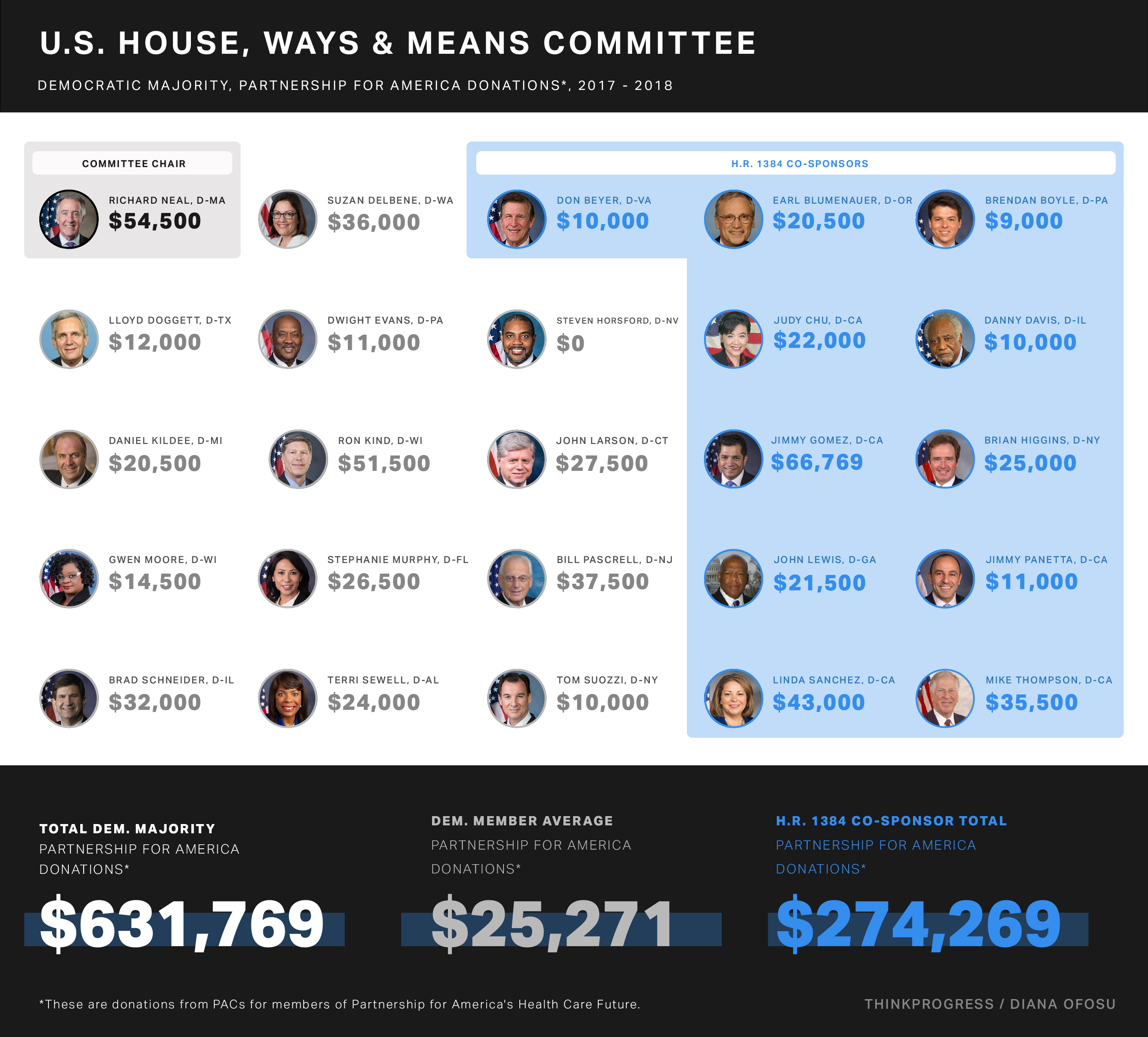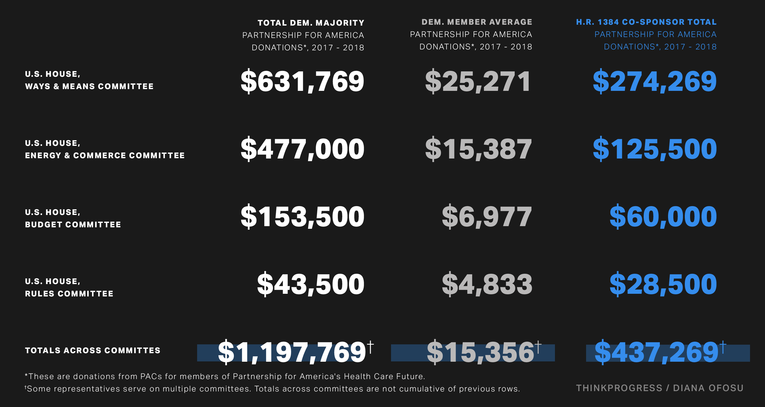 A ThinkProgress analysis found that those industries, part of a coalition called the Partnership for America’s Health Care Future, donated nearly $1.2 million in the 2017-2018 election cycle to Democratic members of four key House committees that could determine the fate of Medicare for All.