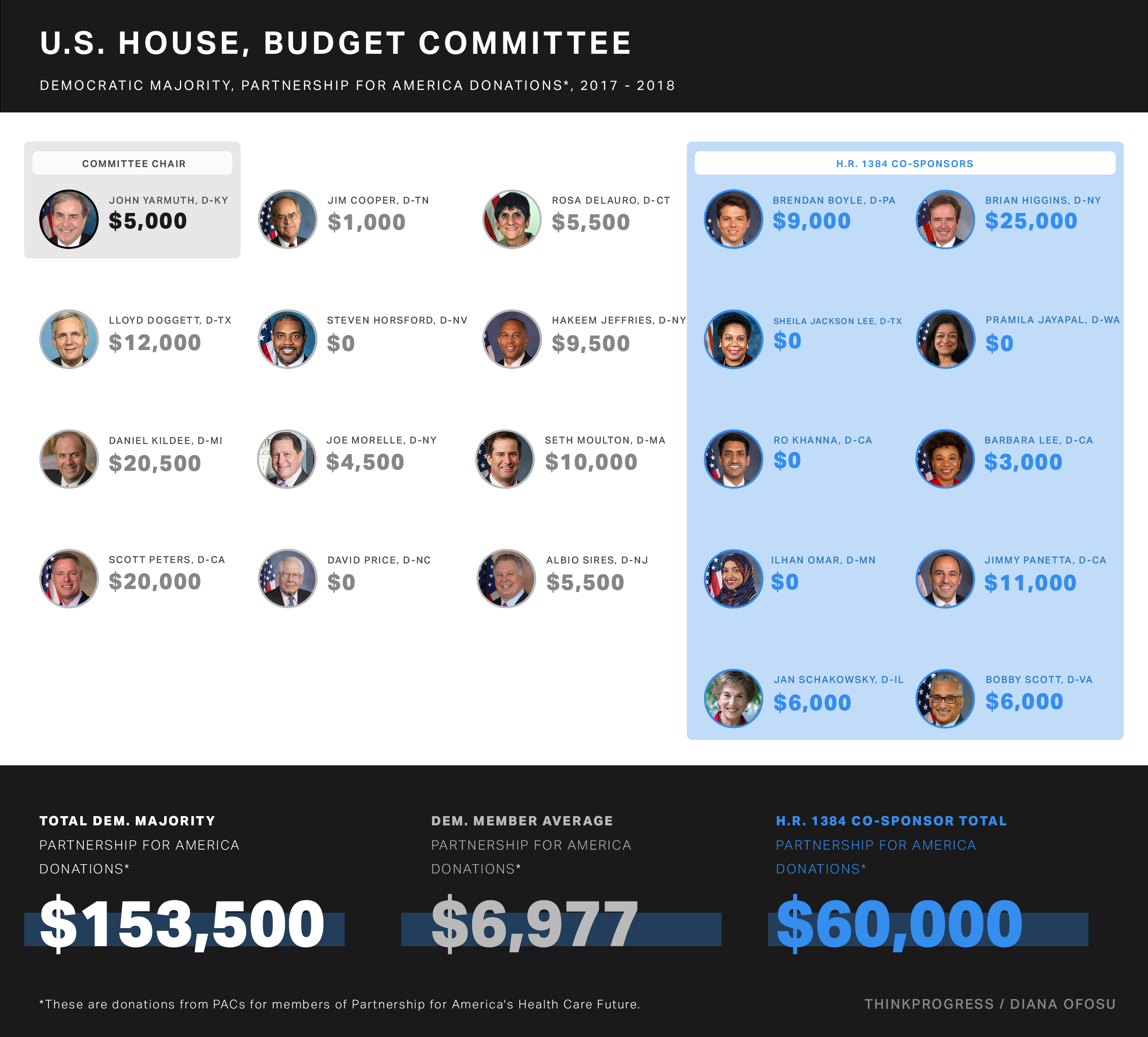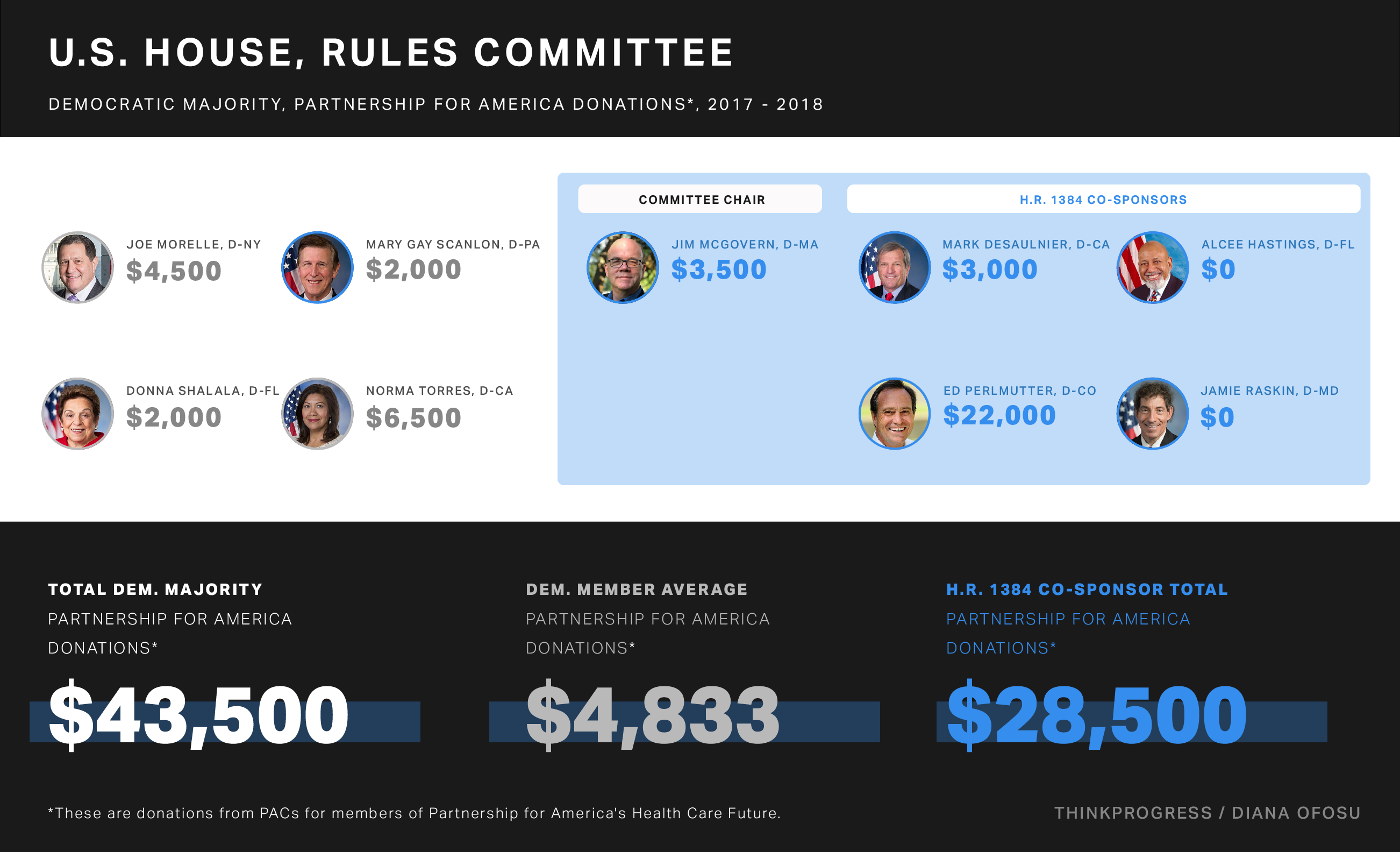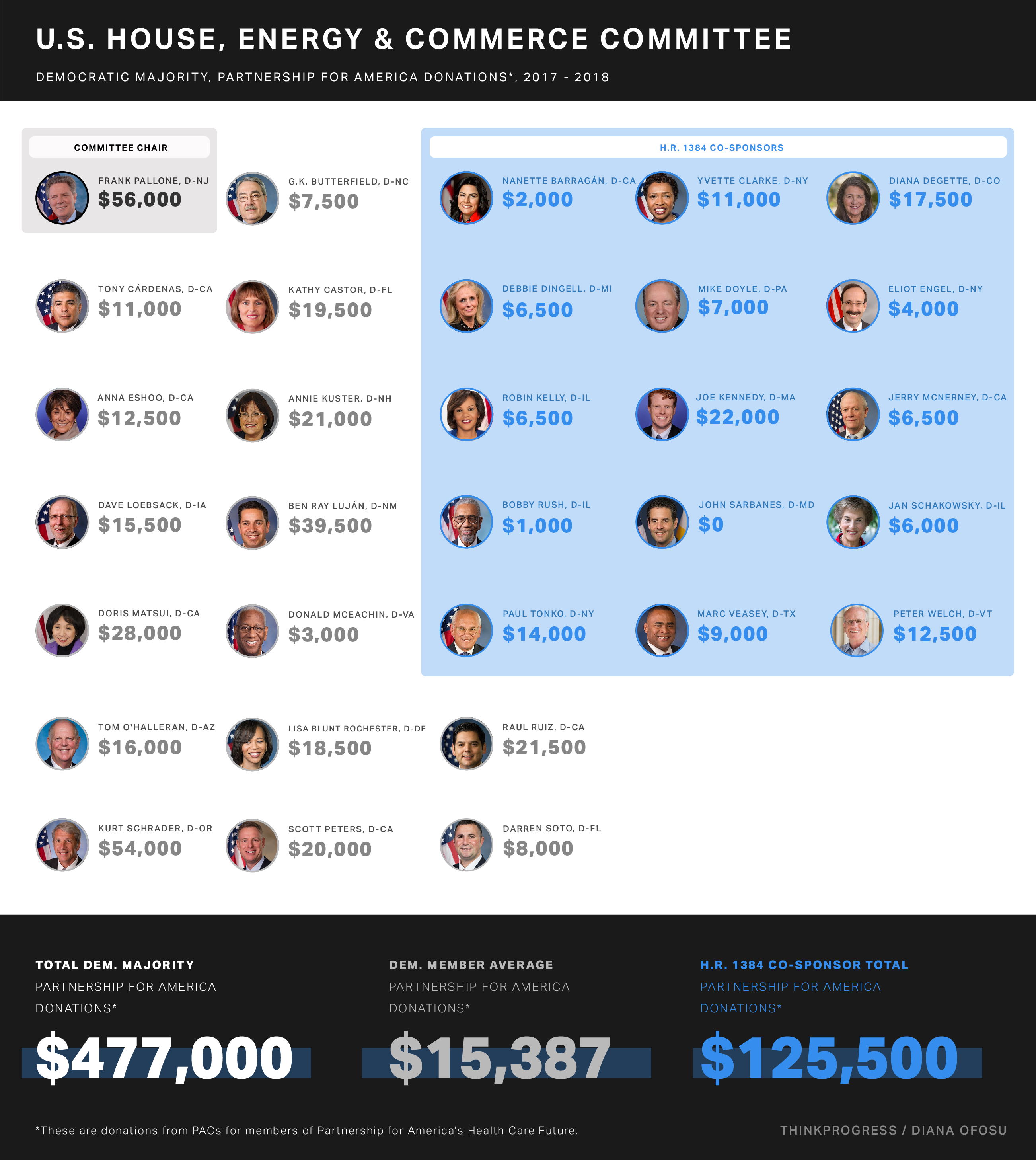 A ThinkProgress analysis found that those industries, part of a coalition called the Partnership for America’s Health Care Future, donated nearly $1.2 million in the 2017-2018 election cycle to Democratic members of four key House committees that could determine the fate of Medicare for All.