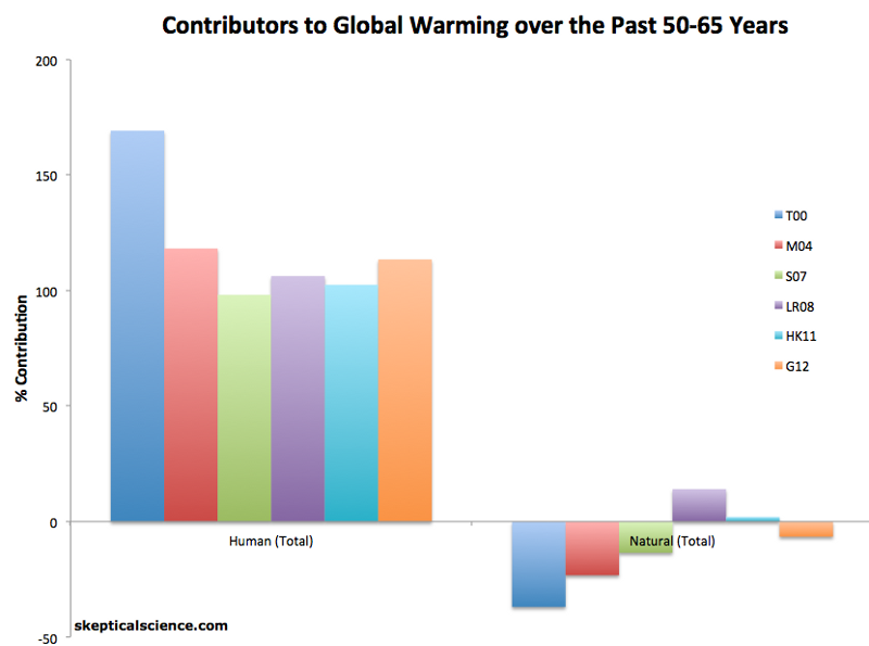 More importantly, the Cato argument is intellectually lazy, because it fails to actually examine the causes of these warming periods. A number of climate scientists have conducted attribution studies and universally find that while the 1910–1945 warming was predominantly caused by natural effects (i.e. increasing solar activity and an extended period of low volcanic activity), the warming over the past 50 years has been dominated by human GHG emissions (Figure 1).