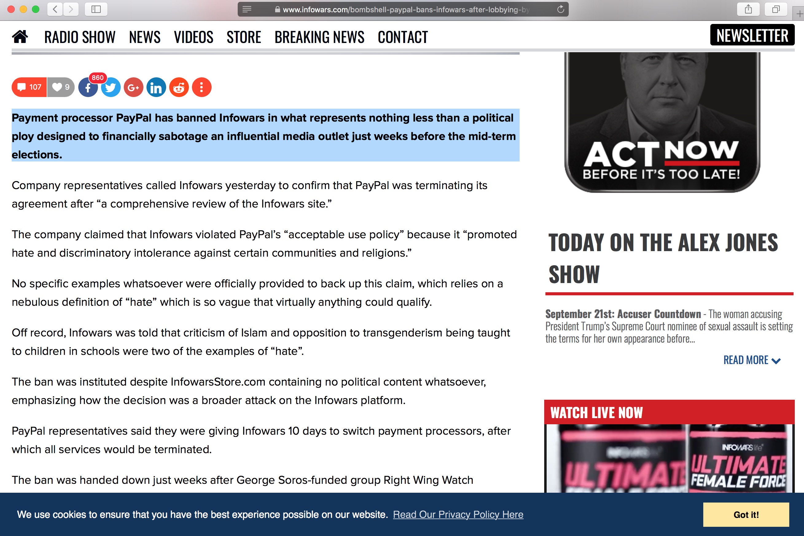 In an article (a screenshot of which can be seen here so you don’t have to click through to their website), one Infowars contributor wrote that PayPal’s decision “represents nothing less than a political ploy designed to financially sabotage an influential media outlet just weeks before the mid-term elections.”