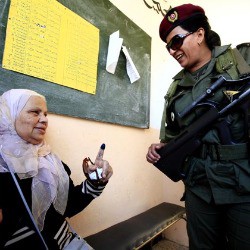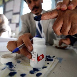Ten months after vegetable seller Mohamed Bouazizi set himself ablaze in a desperate act of protest against poverty and government repression which spurred the Arab Spring uprisings, Tunisians are flocking to the polls to cast a vote to install the first democratic government in their nation’s history. By all accounts, the turnout is large, but the voting is taking place peacefully. Tunisians are dipping their fingers in blue ink to mark the fact that they casted a ballot.
