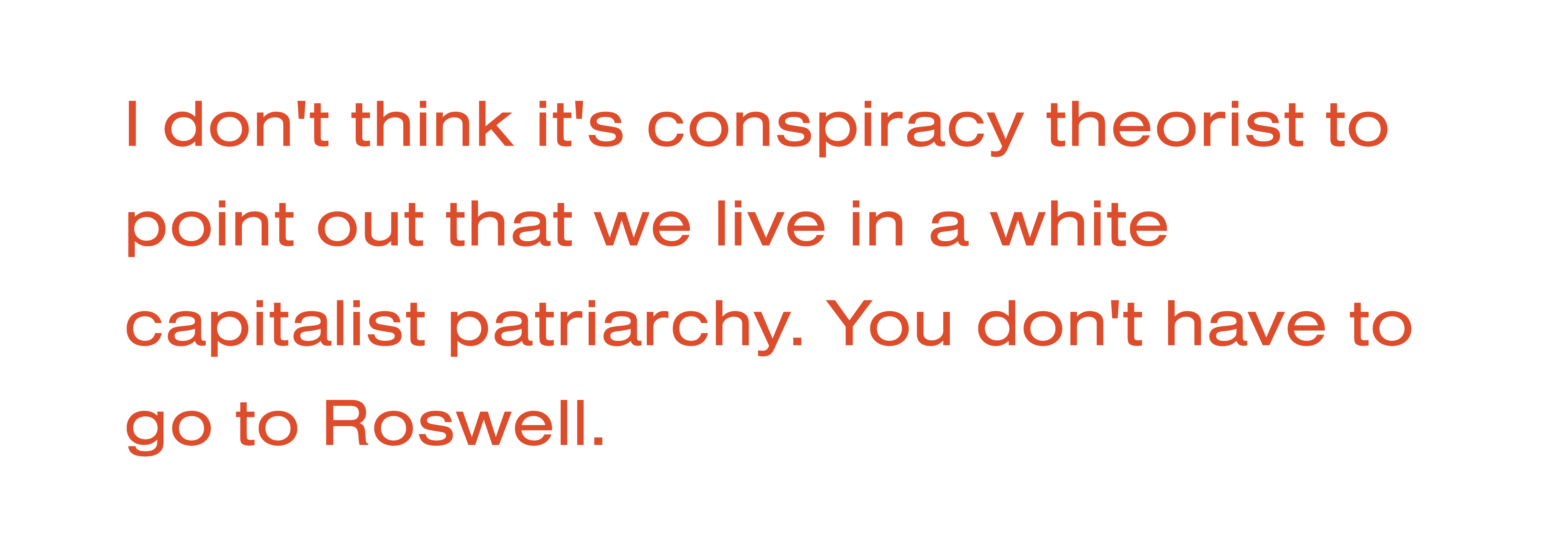 “It’s not a conspiracy theory,” she tells me by phone. “Look at the very structure of our government. I don’t think it’s conspiracy theory to point out that we live in a white capitalist patriarchy. You don’t have to go to Roswell.”