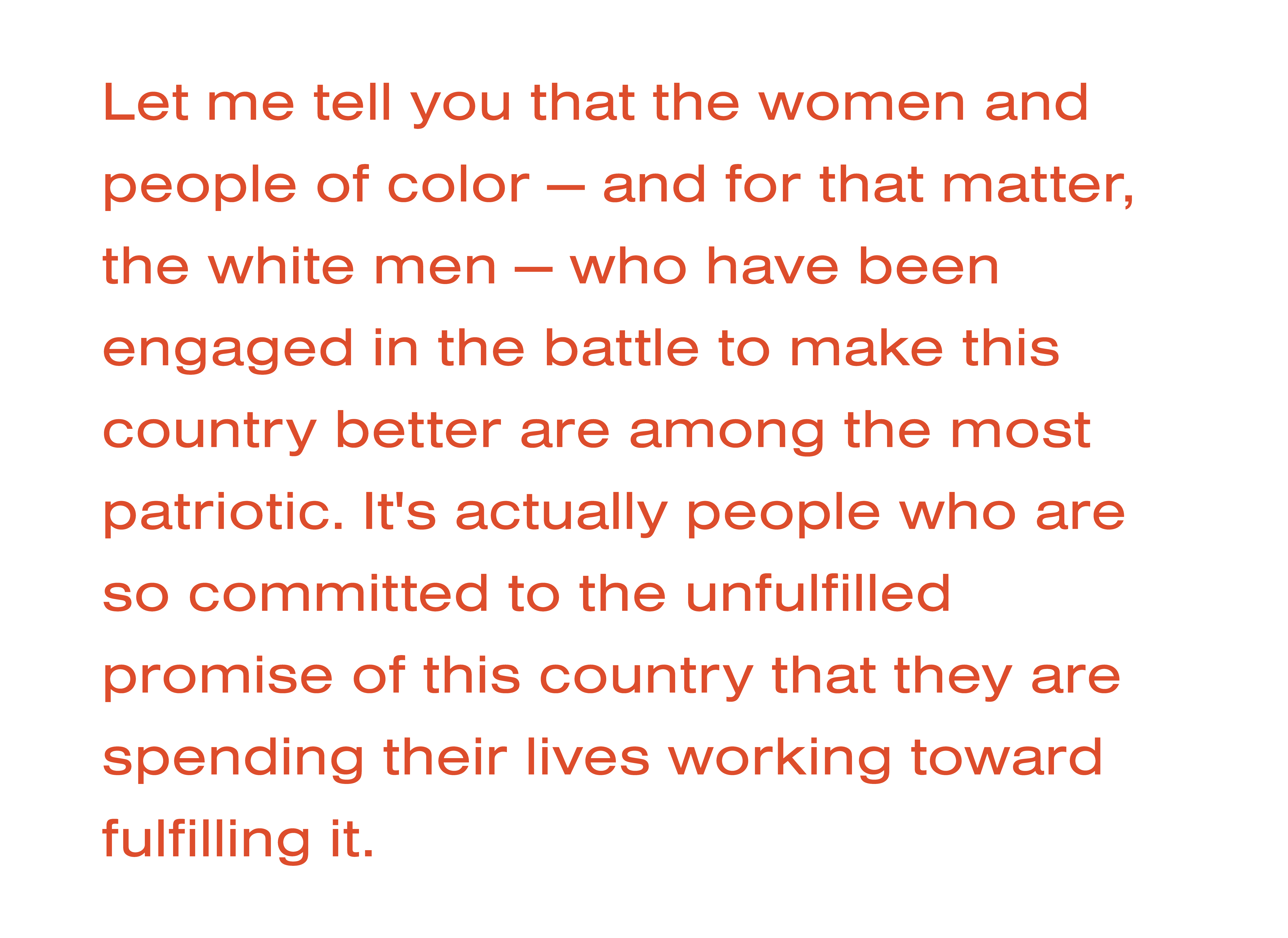 Let me tell you that the women and people of color — and for that matter, the white men — who have been engaged in the battle to make this country better are among the most patriotic. It’s actually people who are so committed to the unfulfilled promise of this country that they are spending their lives working toward fulfilling it. That is a deep form of patriotism.
