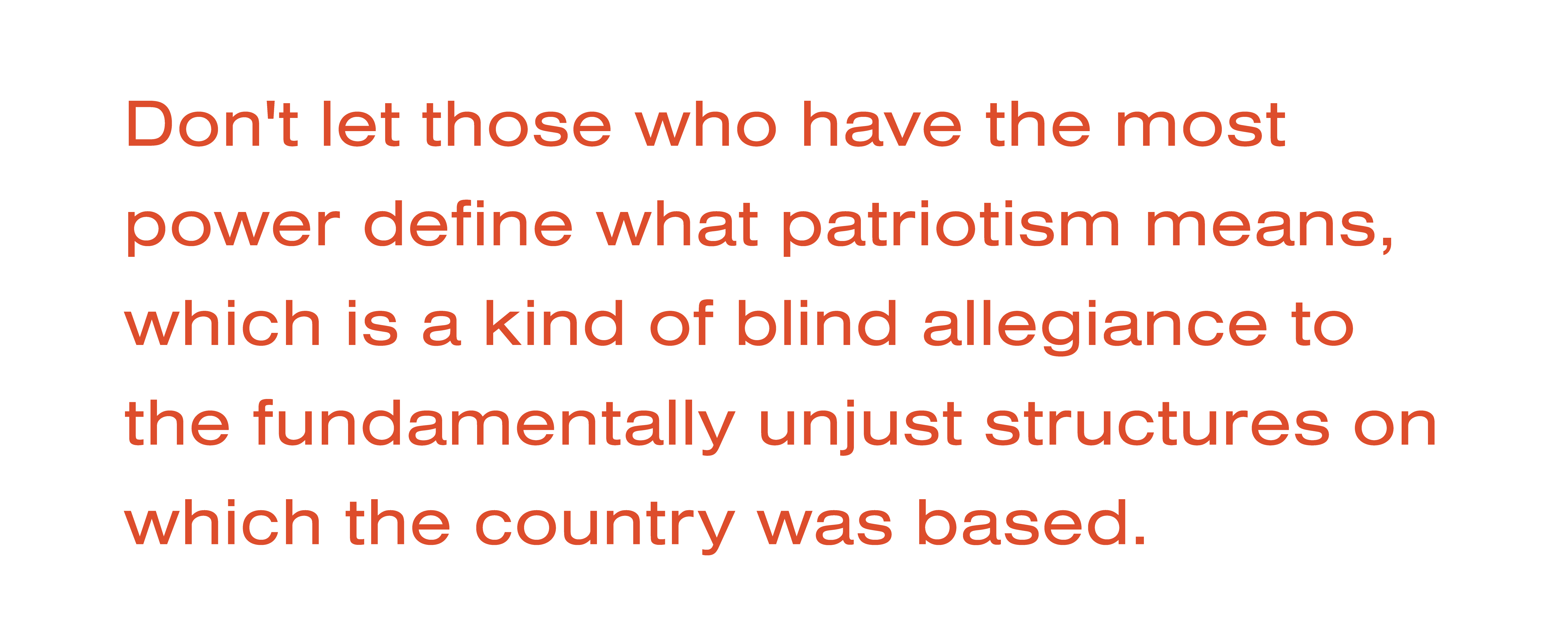Don’t let those who have the most power define what patriotism means, which is a kind of blind allegiance to the fundamentally unjust structures on which the country was based. It’s those who have been laboring and putting their lives and livelihoods on the line over the course of centuries, who have been, in many ways, the most committed to this country and its future, and ensuring that its future is more inclusive for more Americans, that is deep, deep patriotism.