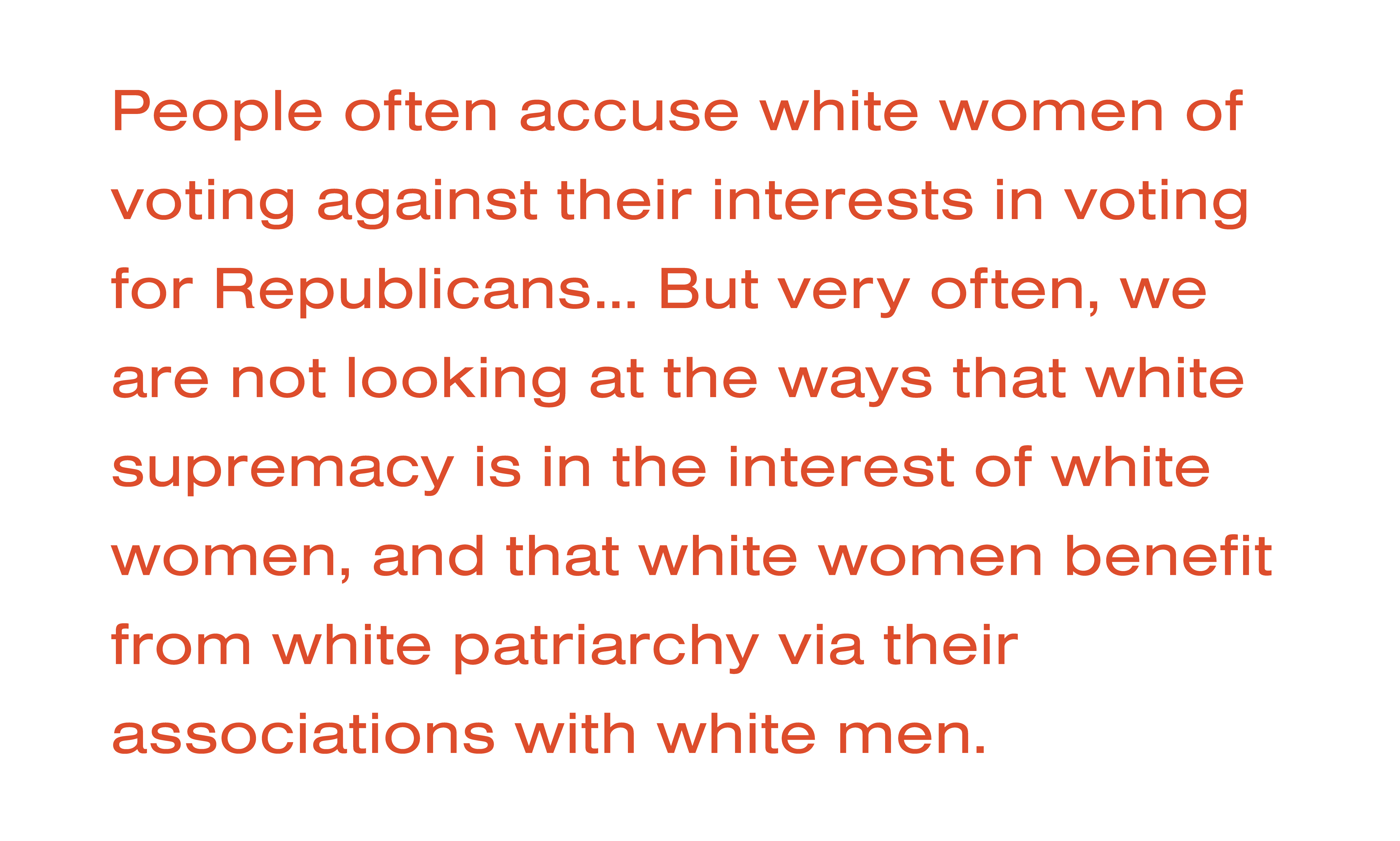 People often accuse white women of voting against their interests in voting for Republicans, because they are voting for a party that doesn’t support equal pay or that doesn’t treat sexual harassment and sexual assault with the seriousness that it should, and that doesn’t support reproductive autonomy. But very often, we are not looking at the ways that white supremacy is in the interest of white women, and that white women benefit from white patriarchy via their associations with white men, and the ways in which those associations can motivate them to vote for the further accumulation of power by powerful white men.