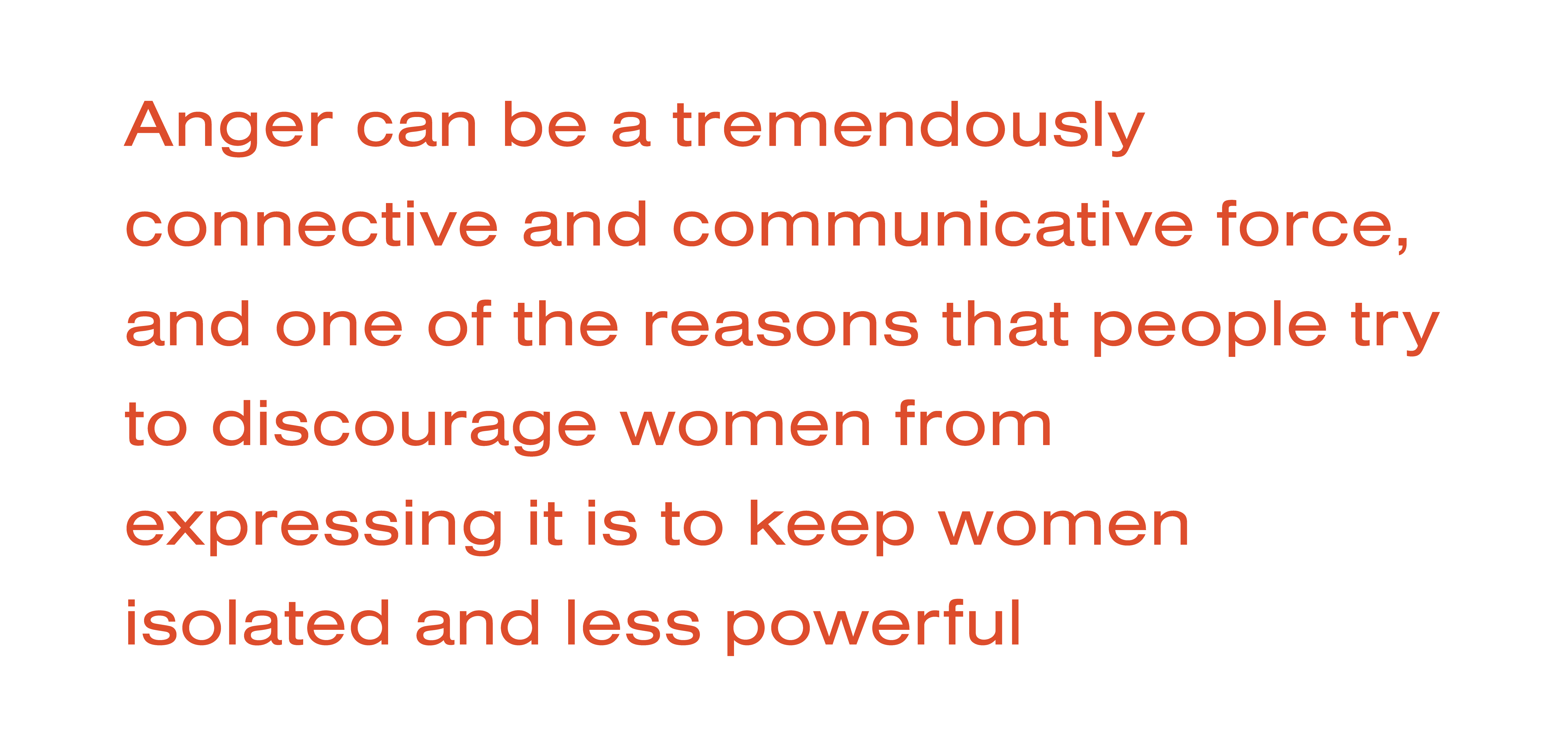 One of the things that people accomplish, if they keep women from expressing their anger, is that keeps women in isolation. Because if you’re not expressing it, it’s just inside you. But if you express it, then you become audible to other people who may share your anger and frustrations, and with whom you might find alliance and coalition, and with whom you might organize. Anger can be a tremendously connective and communicative force, and one of the reasons that people try to discourage women from expressing it is to keep women isolated and less powerful, because it prevents them from making some of those kinds of connections.
