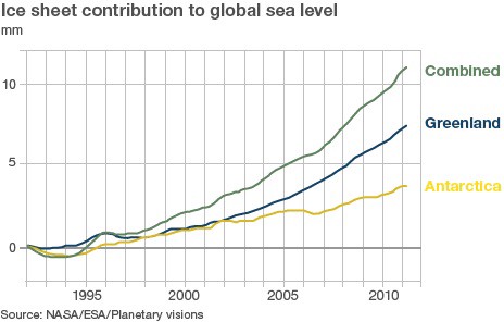“The latest observations of Jakobshavn Glacier show that Greenland’s largest glacier is moving ice from land into the ocean at a speed that appears to be the fastest ever recorded … in summer of 2012 … more than 10.5 miles (17 kilometers) per year, or more than 150 feet (46 meters) per day. These appear to be the fastest flow rates recorded for any glacier or ice stream in Greenland or Antarctica.”