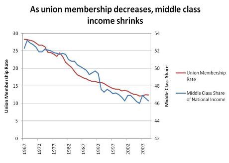 This has had a deterimental effect on the American middle class. As the following chart from CAP’s David Madland and Karla Waters demonstrates, as union membership fell from the 1970’s to the present, the middle class’s share of national income fell as well: