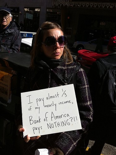,One Uncut US demonstrator carried a sign that read: “I pay almost 1/3 of my measly income, Bank of America pays NOTHING?!!!” (HT: @allisonkilkenny):