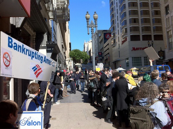 ,Hundreds of demonstrators descended on a Bank of America branch in San Francisco, some carrying signs mocking the bank’s logo as “Bankrupting America” (HT: @jashsf):