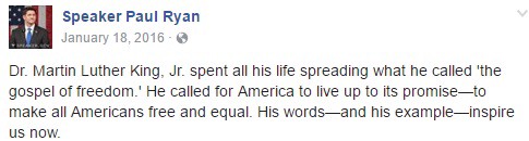 And yet the Republican Party’s budget proposals, many of them authored by Speaker Ryan, may be the greatest rollback in assistance for the poor and the downtrodden since the federal government abandoned its commitment to reconstructing the South after the Civil War. It combines severe cuts to health care, education, and food assistance for the poor with major tax cuts for the rich. It is the very thing Dr. King marched against.