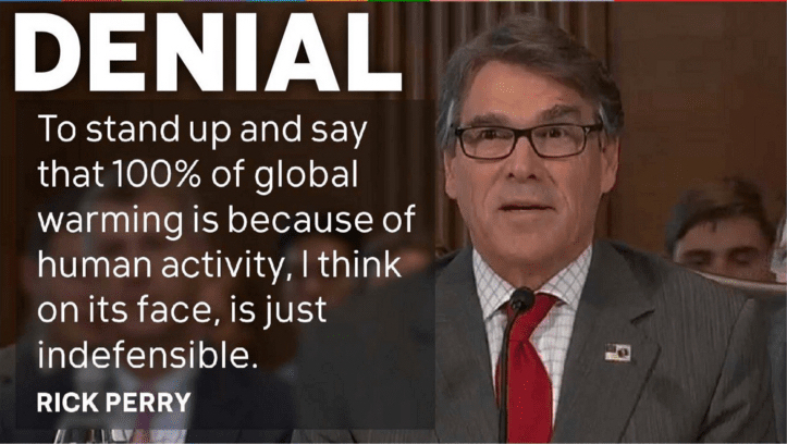The problem for Perry is that if human activity is entirely the cause of recent warming — as the best science says — then obviously the entire solution must involve changing human activity, switching from dirty fossil fuels to clean energy, and so on. But those solutions are precisely what deniers like Perry oppose. Indeed, the hearing was held so that Perry could defend his idea that coal plants should be given bigger subsidies.