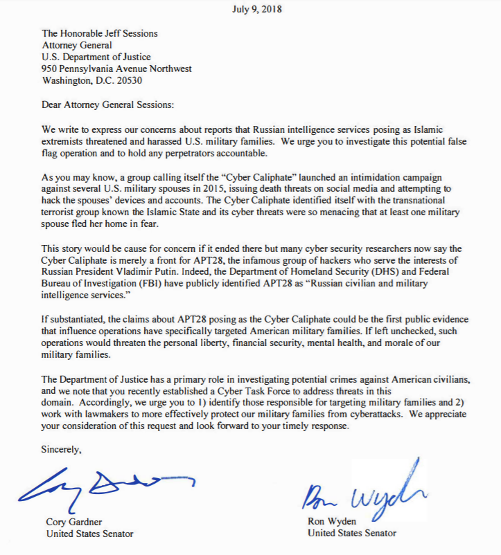 The letter, addressed to Attorney General Jeff Sessions, comes from Sen. Ron Wyden (D-OR) and Sen. Cory Gardner (R-CO). Sent last week, it details how Russian hackers posed as Islamic extremists — and targeted American military families in the process.