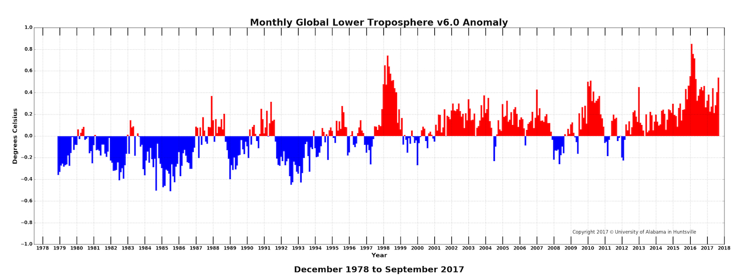 Equally amazing, “of the 20 warmest monthly global average temperatures in the satellite record, only September 2017 was not during an El Niño,” reports Dr. John Christy, director of UAH’s Earth System Science Center — and an infamous climate science misinformer.