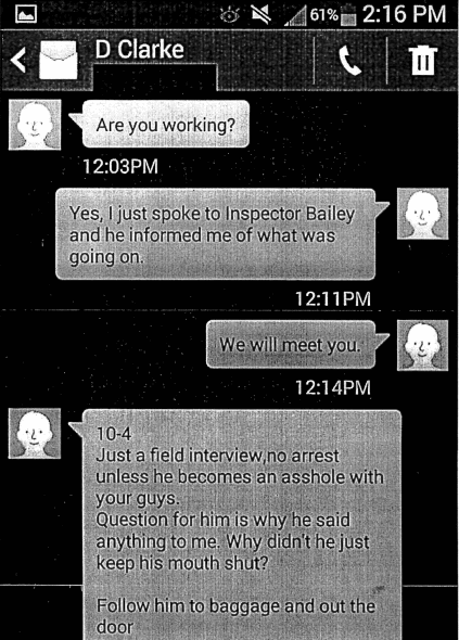 Texts and court documents from Wisconsin show that when a civilian was rude to him on an airplane last year, Clarke called for armed backup. The sheriff texted his deputies to instruct them to wait at the gate and interrogate a man named Dan Black. Black’s offense? Staring at Clarke and shaking his head slowly, in what Clarke’s attorneys now call “a physically threatening manner.”