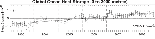Global hydrographic variability patterns during 2003–2008 (Schuckmann 2009) analyses ocean temperature measurements by the Argo network, constructing a map of ocean heat content down to 2000 metres (H/T to Chris for bringing it to my attention). This is significantly deeper than other recent papers that focus on upper ocean heat, only going down to 700 metres. They constructed the following time series of global ocean heat: