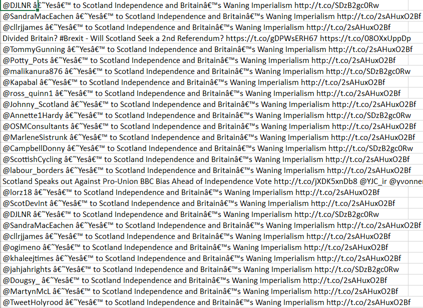 Many of those tweets were straightforward, calling for people to say “‘Yes’ to Scotland independence and Britain’s Waning Imperialism.” They all linked out to one site: “AWD News.”