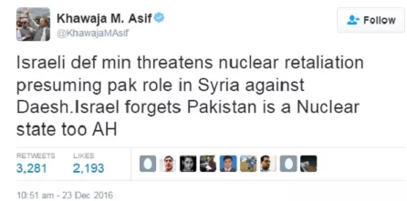None of these obvious signs — nor the fact that Pakistan hasn’t even come close to sending ground troops to Syria — deterred Asif from responding. Shortly after Asif’s warning, the Israeli Ministry of Defense responded via Twitter, noting that the “AWD News” post was false.