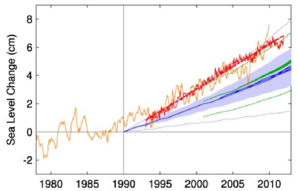Figure: Sea level measured by satellite altimeter (red with linear trend line) … and reconstructed from tide gauges (orange, monthly data from Church and White (2011))…. The scenarios of the IPCC are shown in blue (third assessment) and green (fourth assessment); the former have been published starting in the year 1990 and the latter from 2000.