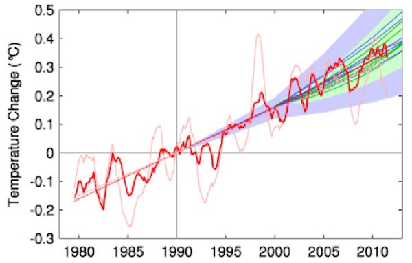 Figure. Observed annual global temperature, unadjusted (pink) and adjusted for short-term variations due to solar variability, volcanoes and ENSO (red) as in Foster and Rahmstorf (2011). 12-months running averages are shown as well as linear trend lines, and compared to the scenarios of the IPCC (blue range and lines from the third assessment, green from the fourth assessment report). Projections are aligned in the graph so that they start (in 1990 and 2000, respectively) on the linear trend line of the (adjusted) observational data.
