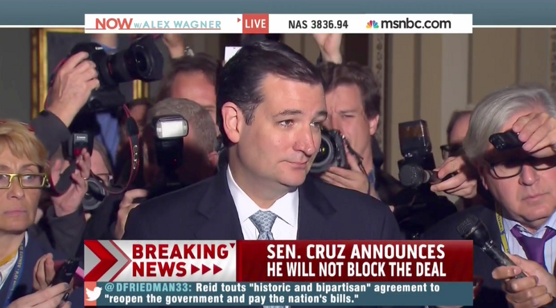 Sen. Ted Cruz (R-TX) conceded on Wednesday that he would not hold up a vote on an emerging Senate deal to re-open the federal government and avert federal default, but admitted that the three-week long budget standoff — which began with his 21-hour speech on the Senate floor — was nothing more than an effort to build up his fundraising list.