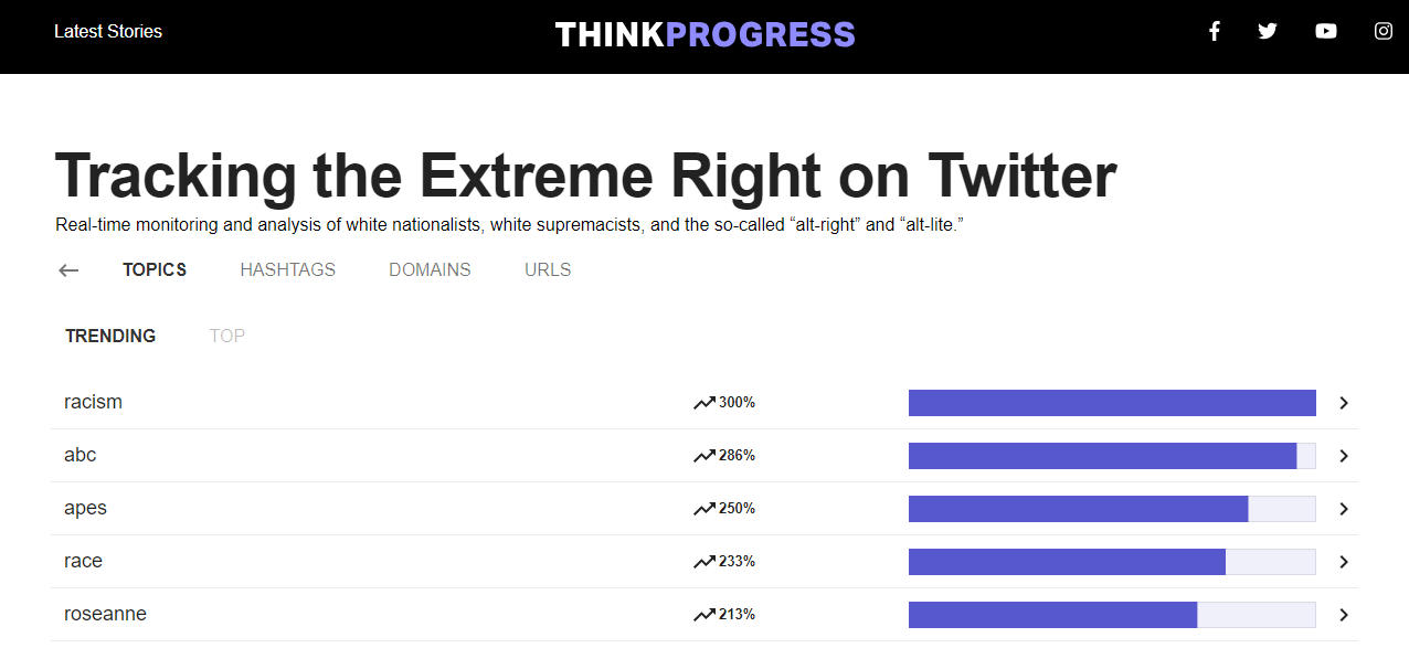 According to the Extreme Right Tracker, which monitors nearly 2,400 Twitter accounts identified as extreme right, the five most prominent trending topics on Wednesday afternoon were all related to ABC’s announcement that the channel would cancel Barr’s eponymous show.