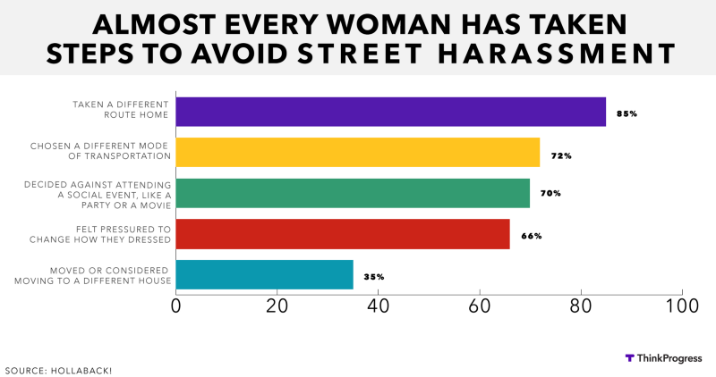 The survey, which polled more than 4,800 people living in the United States, found that the threat of street harassment results in a heightened level of fear and anxiety that can end up distracting women when they’re at work or school. It also leads many people to change their behavior in ways they otherwise wouldn’t have.