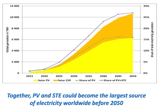 Because of its built-in cheap, efficient storage, CSP — aka Solar Thermal Electric (STE) — has the ability to directly address the “variability” or “intermittency” problem that PV has when the sun isn’t shining. As a result, the 2014 STE Technology Roadmap from the International Energy Agency (IEA) concludes that while PV could generate 16 percent of the world’s electricity by 2050, as much as 11 percent could be generated by STE at the same time.