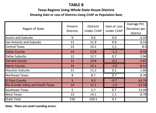 Among other things, Hofeller’s study includes a detailed chart laying out which parts of Texas would gain state house seats and which ones would lose them under Hofeller’s preferred method of drawing legislative lines — a method that would be enabled by the citizenship question. Democratic strongholds like Harris County (Houston) and the Rio Grande Valley would lose seats, while whiter, Republican areas would gain seats.