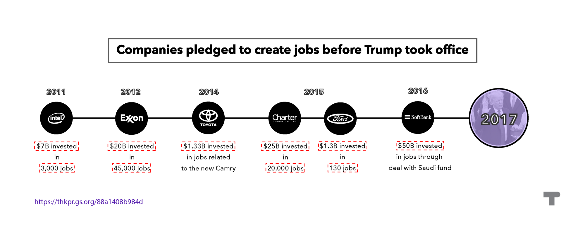 On the campaign trail, Trump made a number of promises about keeping jobs in the country. “A Trump administration will stop the jobs from leaving America,” he told a crowd in Florida in November. “I will bring the auto jobs back to America,” he said in Ohio in October. As part of his effort to prove he’s following up on those promises, he has claimed that a number of recent announcements are due to his election victory.