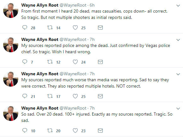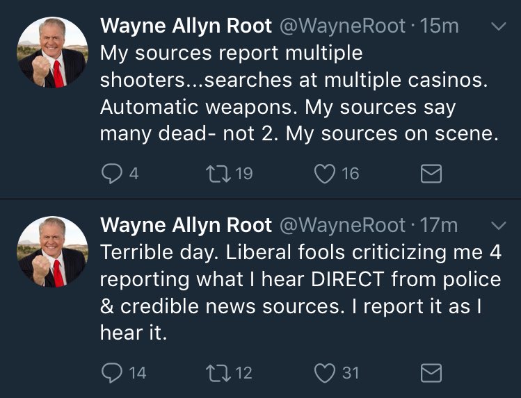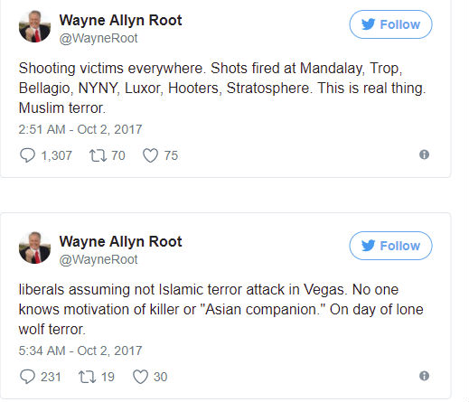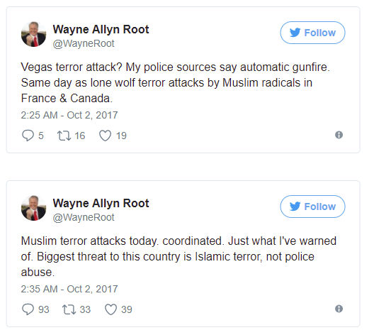 As news of the shooting broke on social media, Wayne Allyn Root, a conservative commentator who regularly opened for then-presidential candidate Donald Trump before his rallies in Las Vegas, tweeted that “sources on scene” and “credible news sources” told him the shooting was a “coordinated Muslim terror attack.”