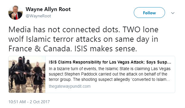 Root wasn’t the only prominent Trump supporter to spread fake news about the Las Vegas shooting. The Gateway Pundit, a pro-Trump blog that has been credentialed by the White House, ran a story Monday morning touting a baseless conspiracy theory about Paddock being “a Democrat Who Liked Rachel Maddow, MoveOn.org and Associated with Anti-Trump Army.” The story appears to have originated from 4chan’s “Politically Incorrect” forums.