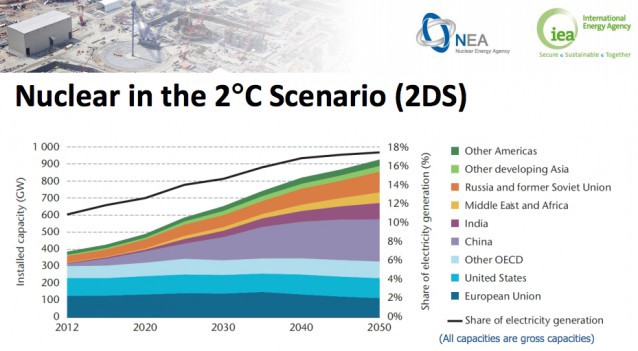 The IEA is the international body responsible for energy analysis, and one of the few independent agencies in the world with a sophisticated enough energy and economic model to credibly examine in detail the role of various low carbon technologies in a 2°C scenario (2DS) aimed at averting catastrophic climate change. The NEA was established by the OECD countries “To assist its member countries in maintaining and further developing, through international co-operation, the scientific, technological and legal bases required for a safe, environmentally friendly and economical use of nuclear energy for peaceful purposes.”